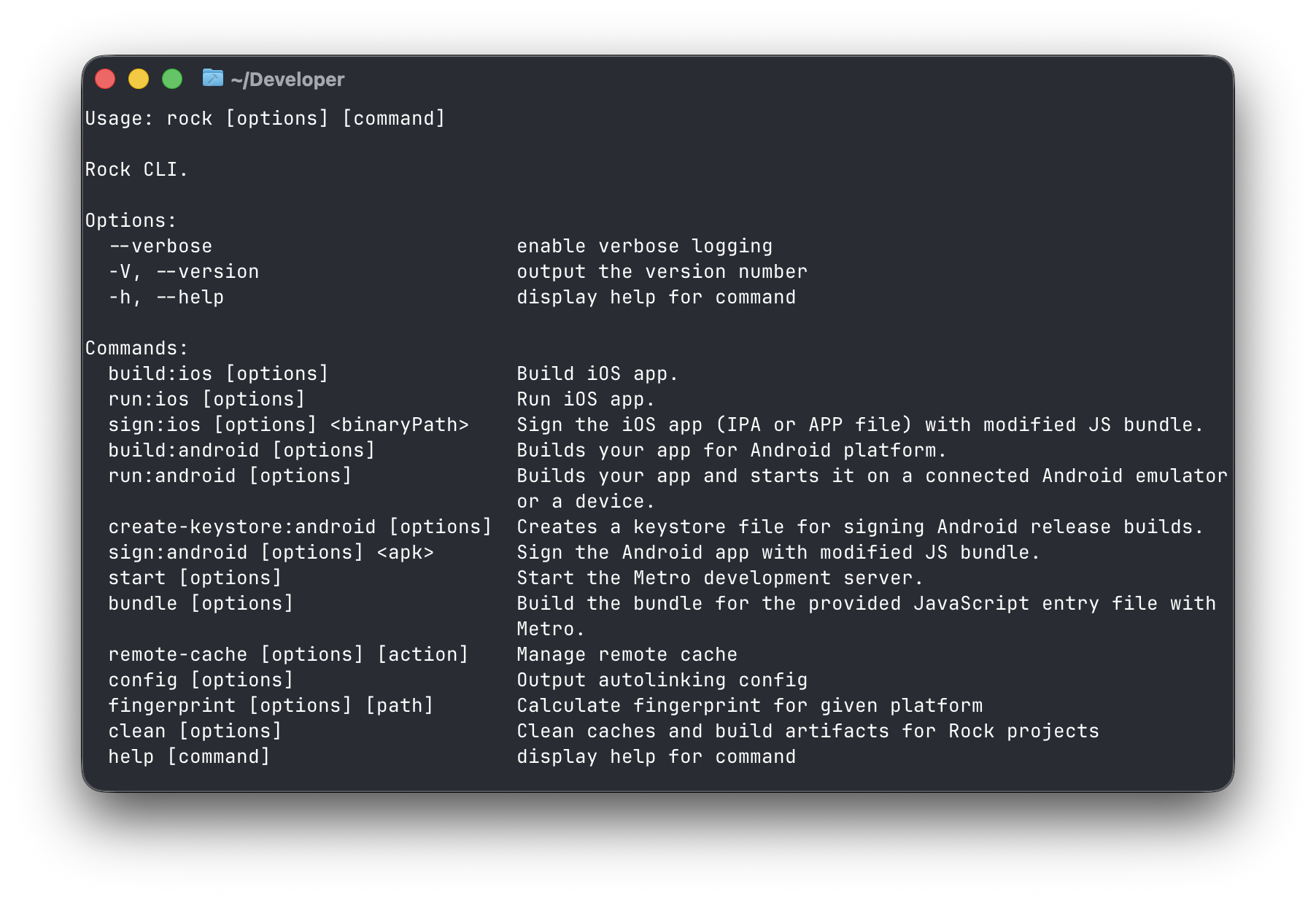 The Rock CLI is a command-line tool that helps you develop, build, and run React Native applications.